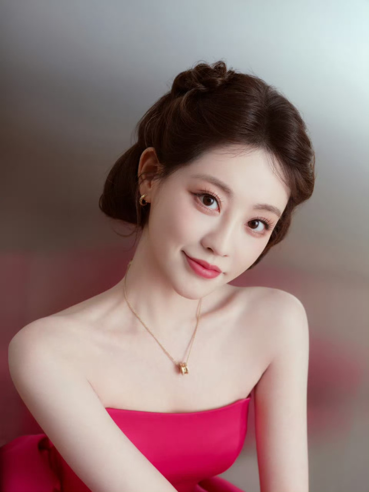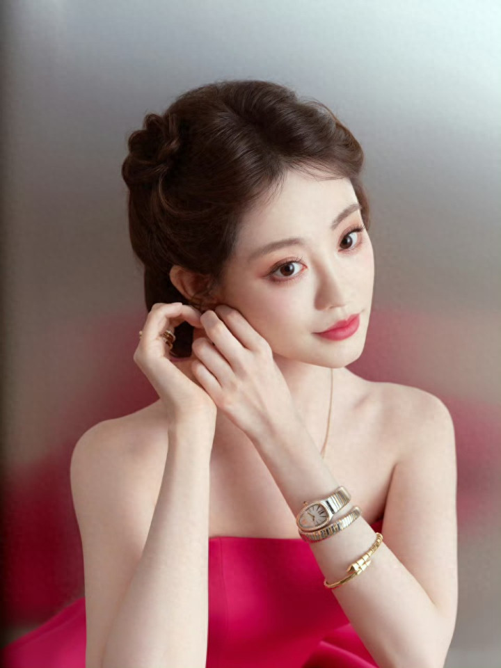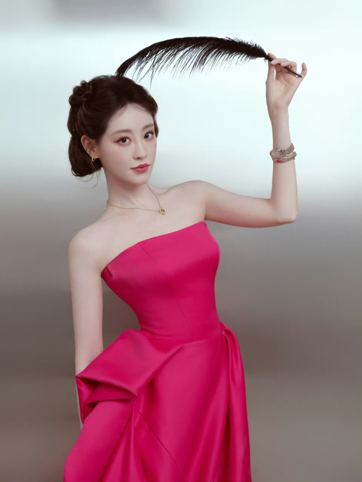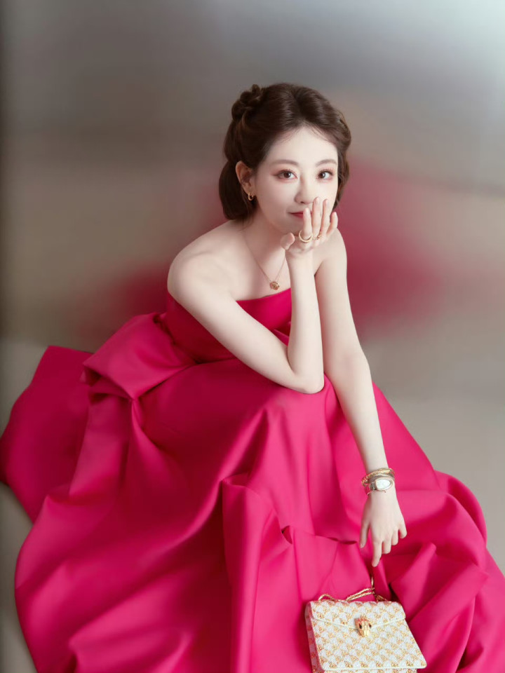 祝绪丹身穿一袭桃粉长裙 白嫩得能掐出水